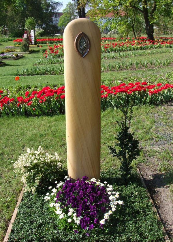 Stein: Stele mit Blatt, Sandstein geschliffen mit Bronze