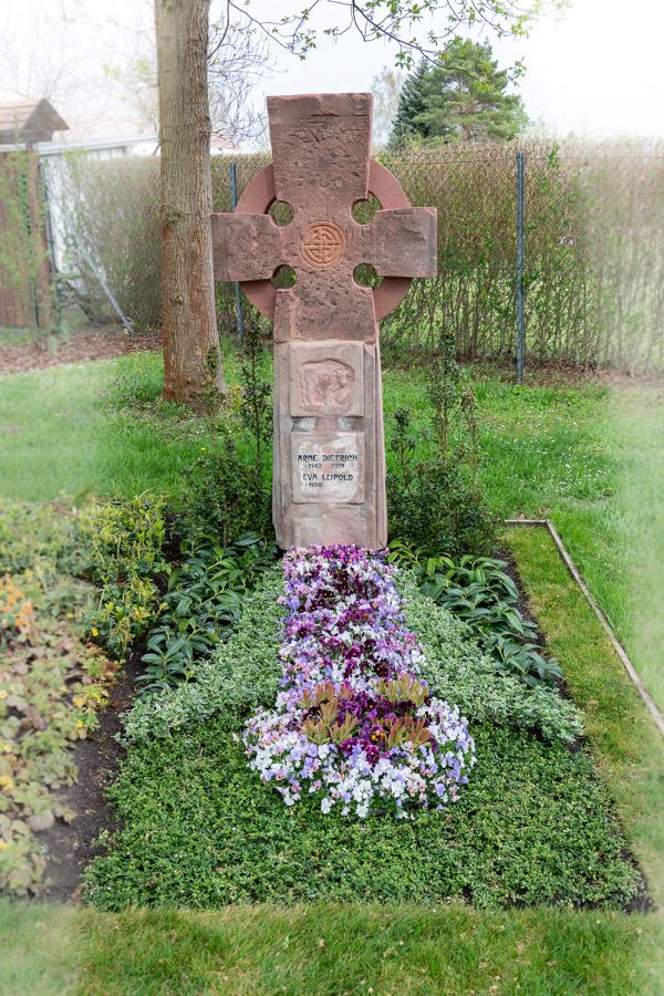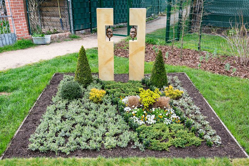 Typ: Doppelwahlstelle Material: Bronze und Warthauer Sandstein Bearbeitung: gespitzt / scharriert Beschreibung: Die Individualität des Einzelnen spiegelt sich auch in Form und Oberflächenbearbeitung wieder.