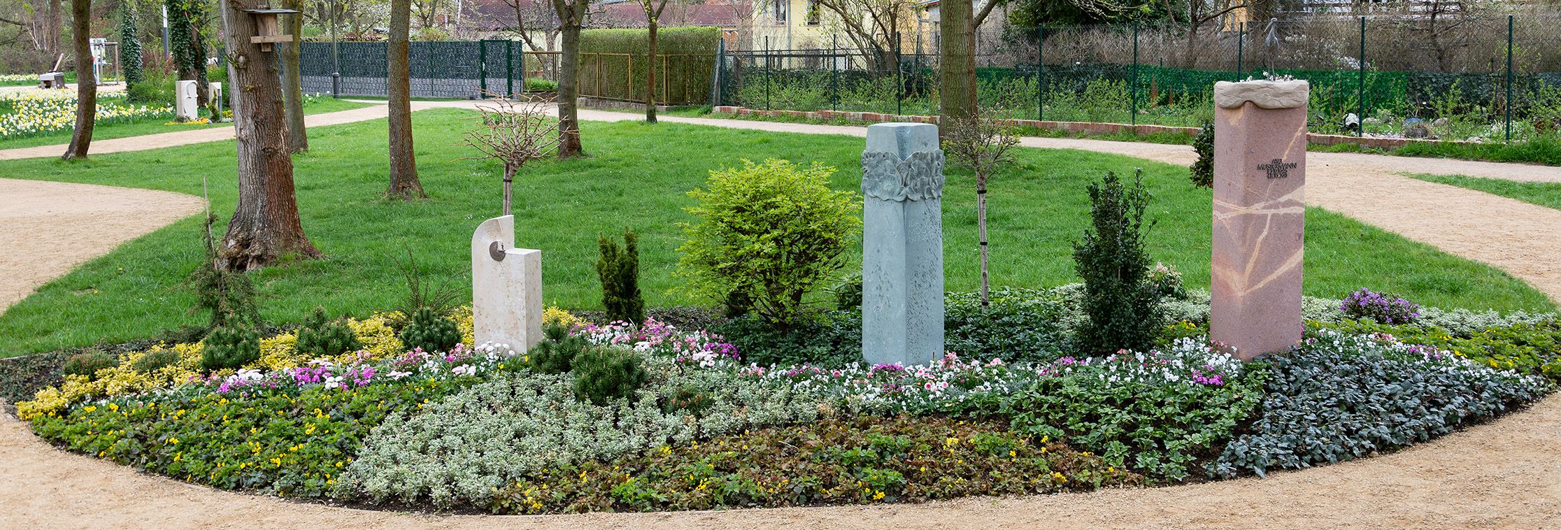 Neben den klassischen Grabarten zeigen wir eine neue und würdevolle gärtnergepflegte Grabanlage. Dies ist eine harmonisch, gestaltetete Anlage, in der Erd- und Urnenbeisetzungen nebeneinander durchgeführt werden. Die nahtlos ineinander fließende Bepflanzung verleiht der Grabanlage einen parkähnlichen Charakter. Im Unterschied zu anonymen Grabanlagen ist es von großer Bedeutung hier alle Verstorbenen namentlich zu benennen.